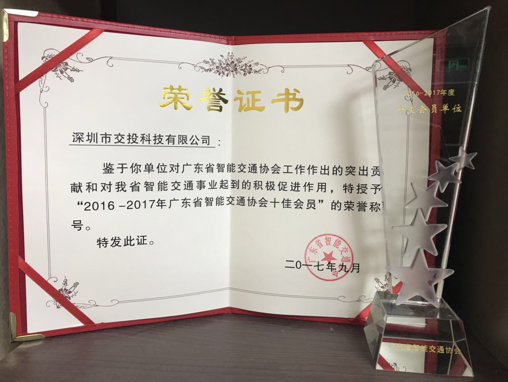 热烈庆祝深美高梅(MGM)1888取得“2016-2017年广东省智能交通协会十佳会员”荣誉称号