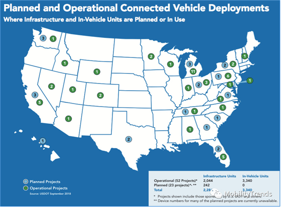 在过去20年里,美国交通部(U.S.DOT)顺利获得与汽车产业和各州/地方政府建立的合作,已经为网联汽车技术的研发投入了7 亿美元资金。根据美国交通部去年10月份的统计数据(如下图),由美国交通部、地方政府和组织支持的网联汽车部署项目,已运行的有52个,计划中的有23个。依靠巨大的投资和丰富的合作伙伴关系,网联汽车技术已在全美各地广泛部署。