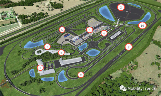二期为复杂城市中心、郊区环境模拟测试区。SUNTRAX城郊环境模拟与其他试验场相比也非常有特点,比如28英亩的动态试验场(上图标注3)包括几乎所有几何形状的道路、交通场景的虚拟现实和增强现实区;城市环境区(上图标注5)模拟各类城市交叉路口布局和复杂的照明、标识、交通信号条件;郊区环境模拟大型多车道交通干线在城市郊区的过渡路段、多条街道斜插在一起的大型交叉路口复杂布局;复杂道路形状测试车道(上图标注7)包含人工制造的起伏不平山路、复杂的水平弯道和纵坡道路条件。二期预计2021年完工对外开放。