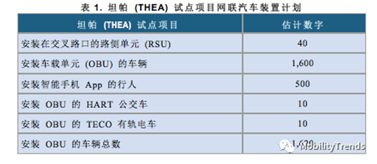 坦帕希尔斯伯勒高速公路管理局(THEA ,Tampa-HillsboroughExpressway Authority)是坦帕试点项目的运营主体。THEA网联汽车试点项目将借助手机App、利用专用短途通信技术 (DSRC) 实现在1600 辆汽车、10 辆公交车辆、10 列电车、 500 名行人以及沿城市街道部署的约40 处路侧单元(参见表 1)之间的信息传输,改善坦帕市中心的安全和交通状况。